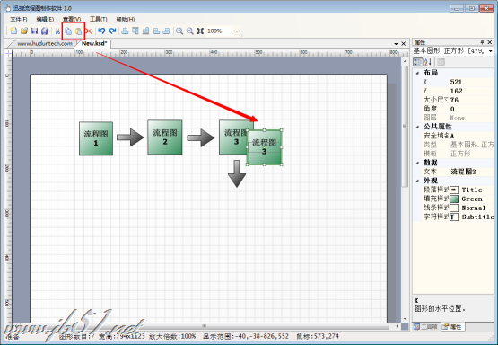 3、在绘制流程图的时候,若是同一个素材需要绘制多个时,可以在选中图形后,点击菜单栏上的“复制”按钮,接着再点击“粘贴”按钮,即可成功复制素材。