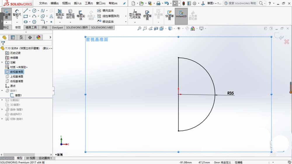 2、选定前视基准面,正视所选基准面,利用直线命令、圆弧命令进行绘草图,并设定相关尺寸。