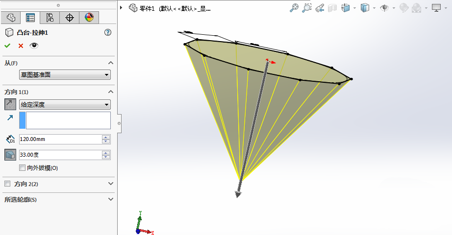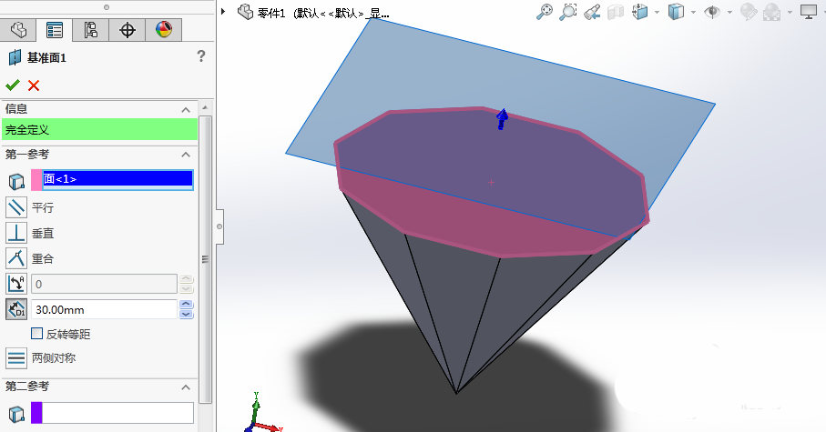 2、使用拉伸凸台和拔模命令,建立钻石下半部分的模型。