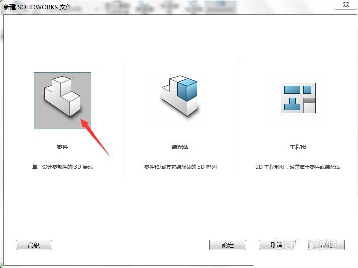 1、打开SolidWorks,选择新建零件模型。