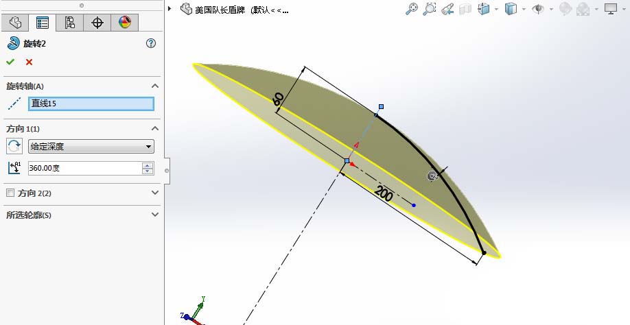 3、通过旋转凸台命令,进行建模,得到盾牌的基本形状。