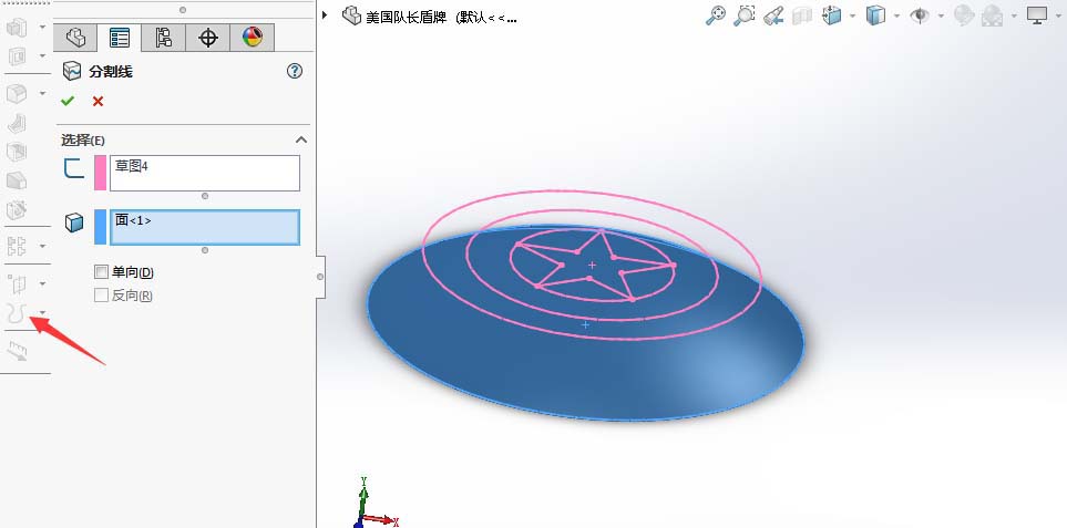 6、退出草图,然后使用曲线指令中的分割线命令对实体进行切分。