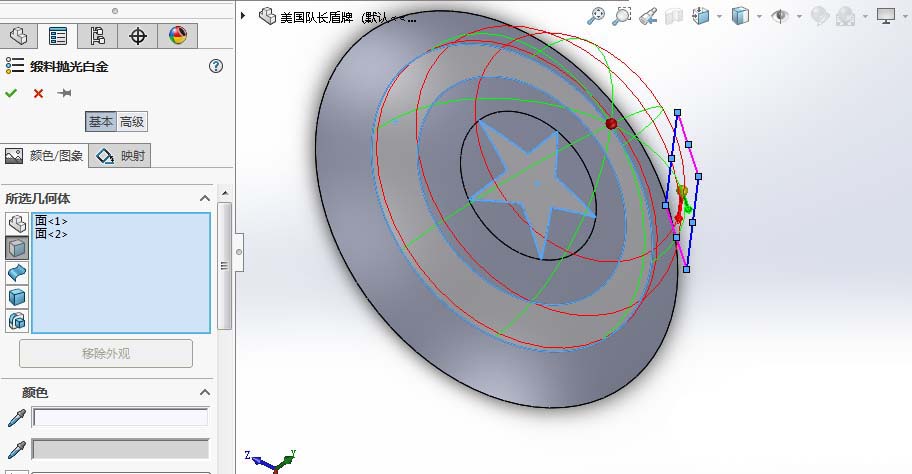 8、我们知道美国队长盾牌的颜色从内到外分别是白、蓝、红、白、红。先上白色,为了美观我选择了白金色。如图,选取对应面,编辑外观。