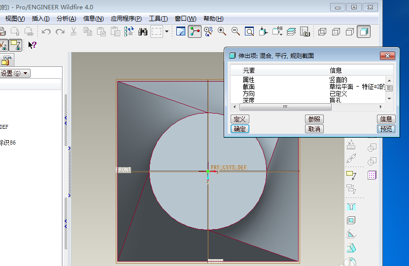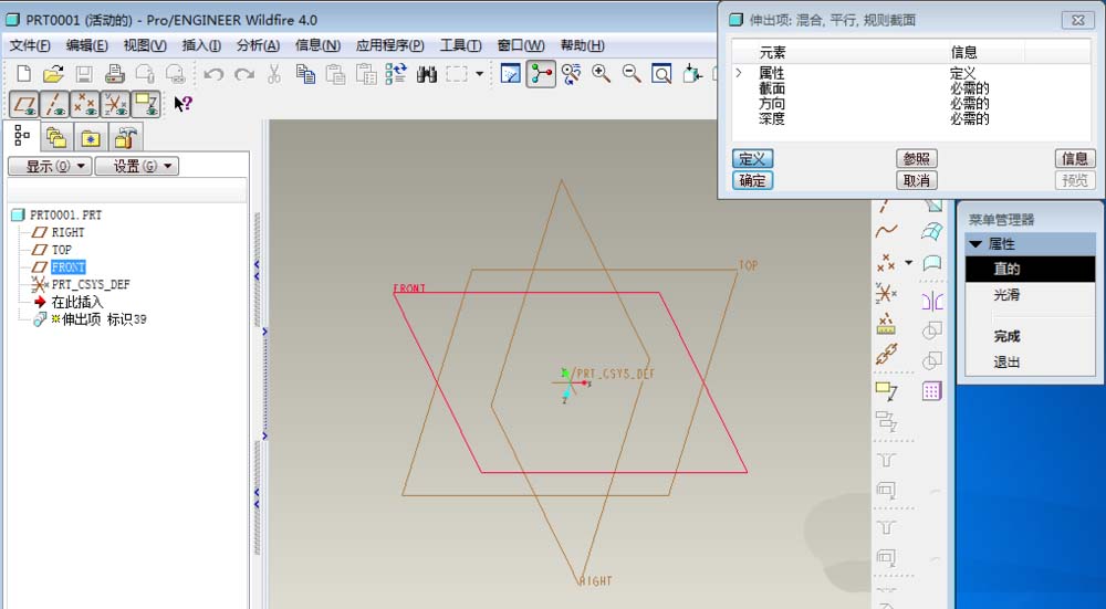 2、点击“插入/混合/伸出项”,开始进行以“混合”命令建模。在“菜单管理器”中,依次选择“平行/规则截面/草绘截面”,然后点出确定。