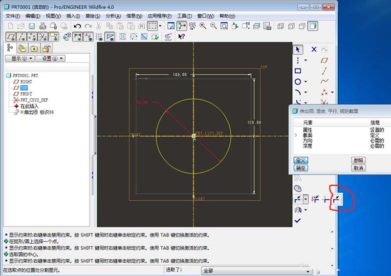 3、选择好草绘平面,再在属性中点出“直的/完成”,然后开始定义截面