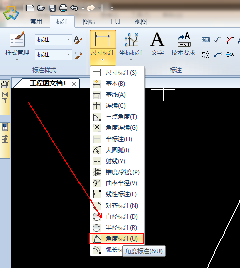 7、在弹出的菜单列表中单击【角度标注】选项。