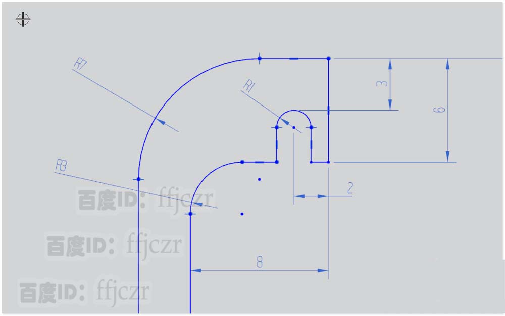 2、标注尺寸对轮廓线进行约束,底部为矩形状,长为11宽为4;矩形与上臂连接杆厚度为3。上部为多圆弧连接,具体参数如图所示。