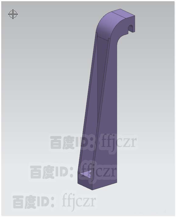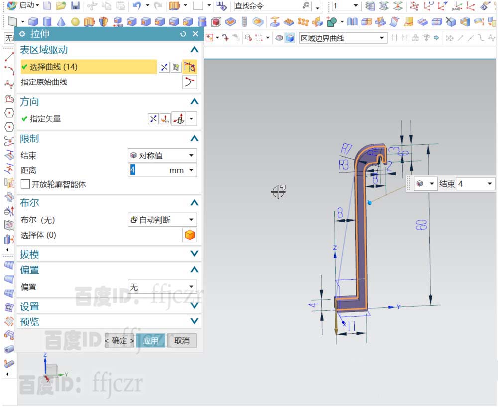 4、回到建模模式选用拉伸命令,截面线为上步绘出的钩状截面线;拉伸方式为对称,距离为4。确定后得到模型的基本结构。