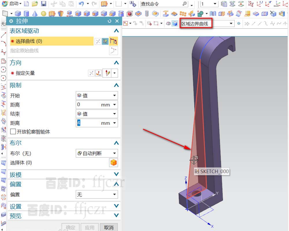 6、拉伸命令,选择上步绘制的加强筋为截面线;开始值为3结束值为4,选择与主体模型进行布尔合并。得到一边的加强筋。