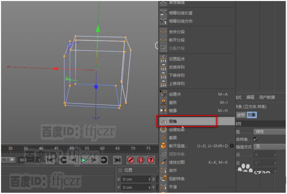 5、将得到的样条从立方体组中移出来 ,原立方体隐藏;点模式下选中样条的所有点进行倒角,倒角半径为20.