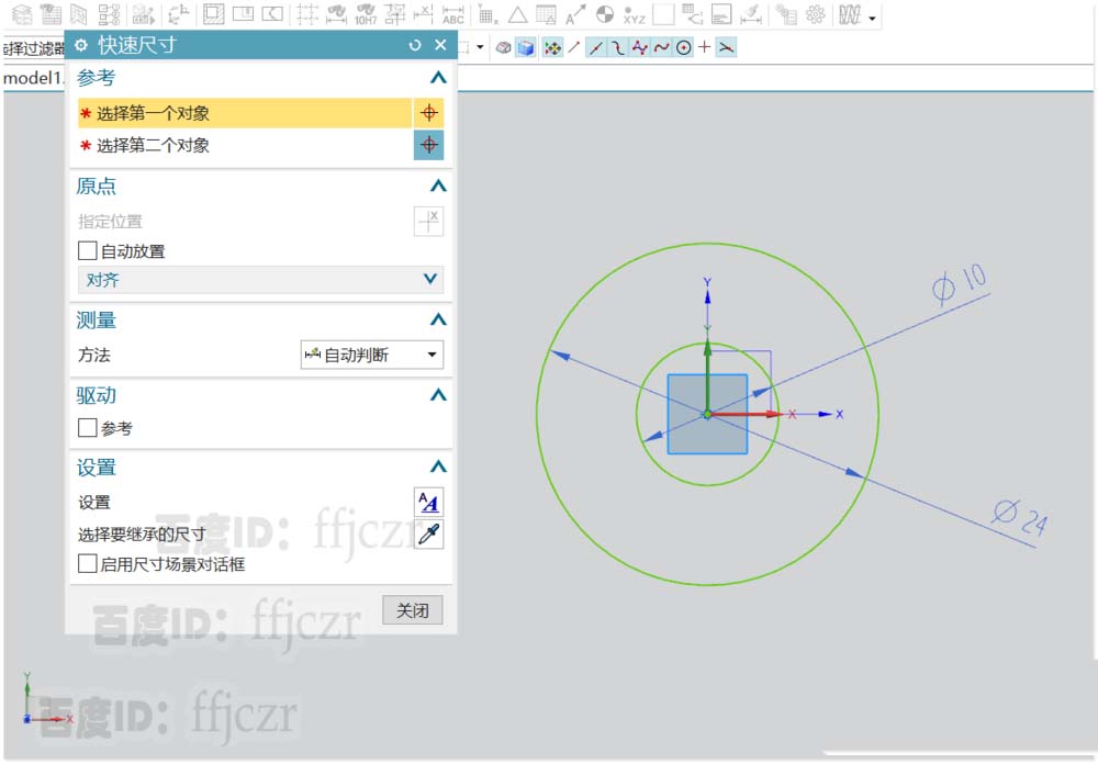 1、首先创建出带孔的圆柱。选用拉伸命令,以XY面为草绘平面。在草绘中以坐标原点为圆心,绘出二个同心圆,直径分别为:10、24.