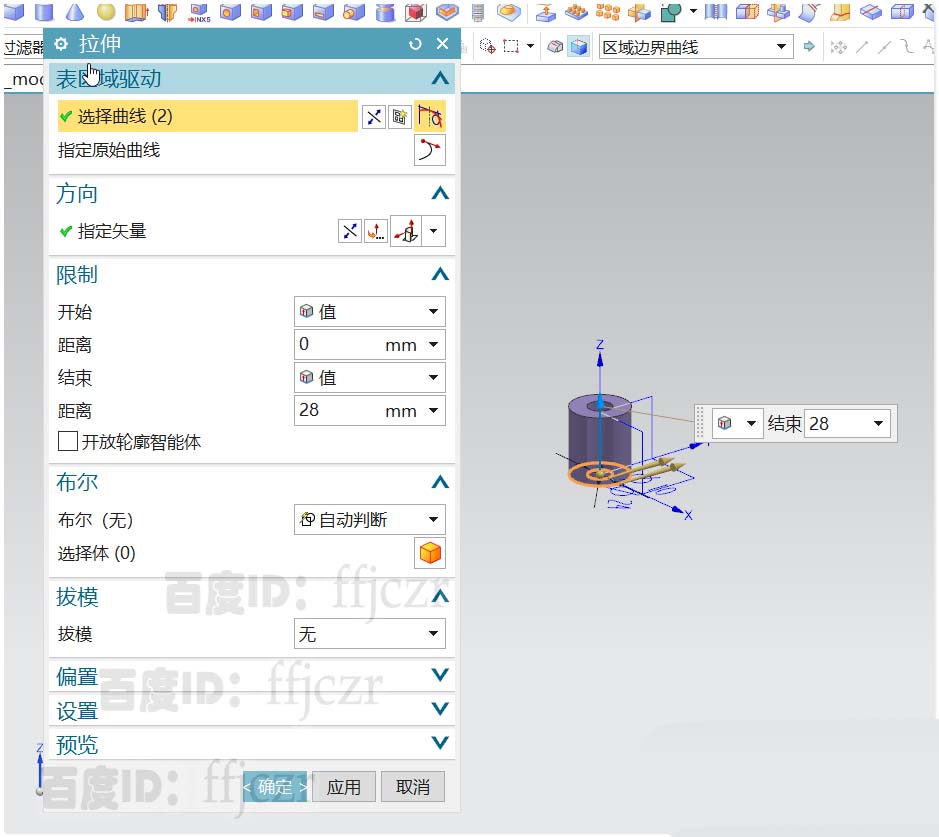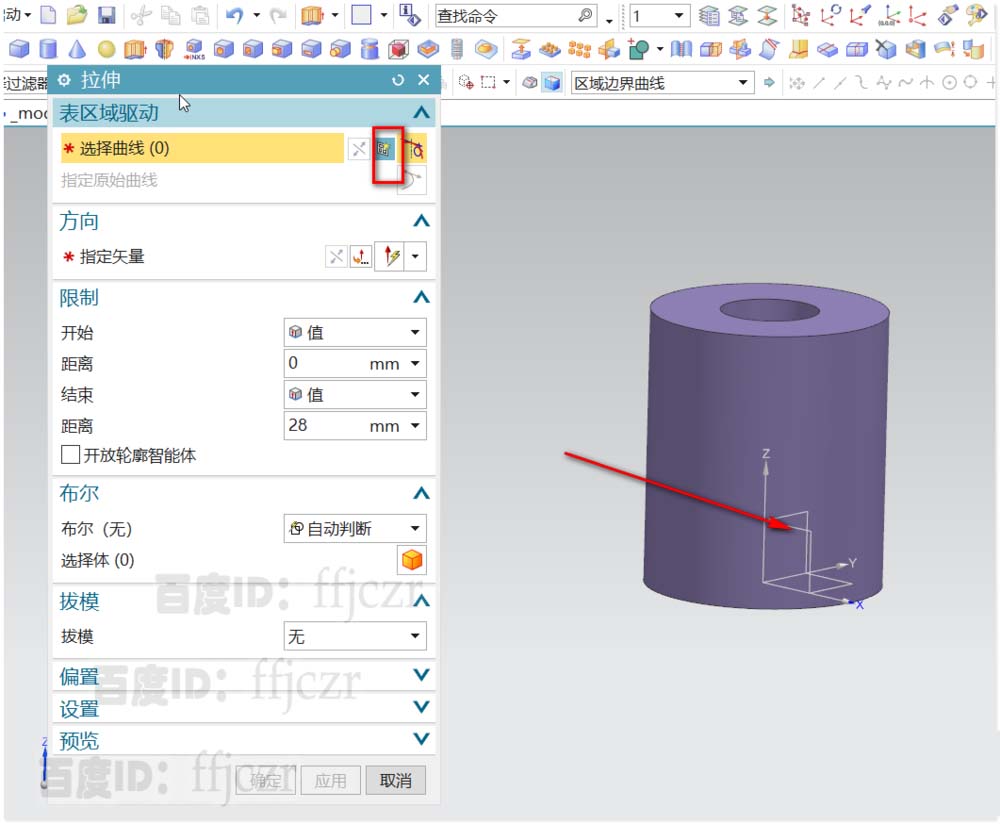 2、回到拉伸命令,矢量方向为+z,拉伸高度为28.得到带孔的圆柱体。