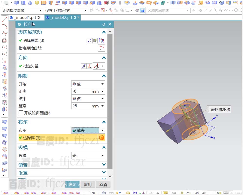 5、回到拉伸命令,调整拉伸的数值:开始值为-8,结束值为28(此值只要高出 圆柱面即可);与圆柱进行布尔求差。得到最终模型。