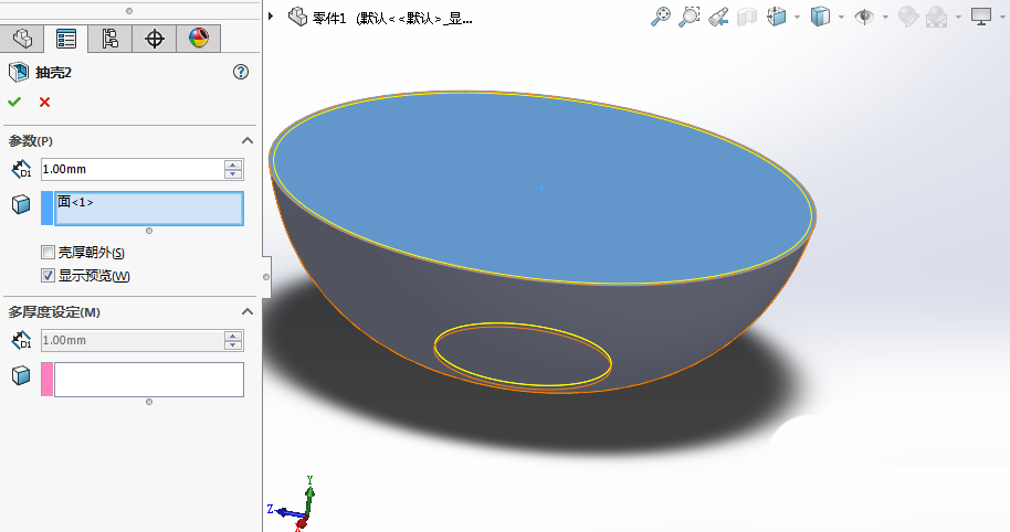 10、通过抽壳的操作,将碗的内部挖空,得到一个上开口的1mm厚度壳体。