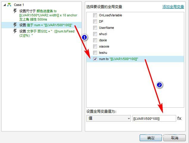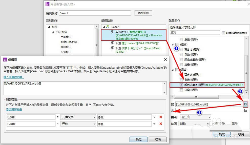所以”矩形:颜色进度条“的长度为:[[LVAR1/500*LVAR2.width]]