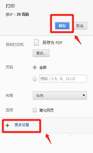 8、点击保存,保存到你想到的位置即可(在下方的更多设置中可以选择关于打印纸张大小等选项)