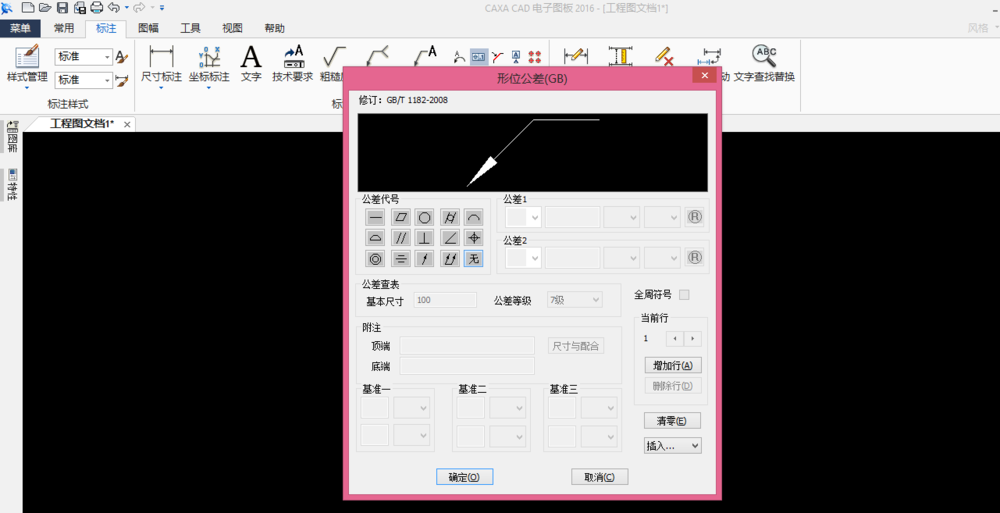 4、从上面的操作栏中找到形位公差功能,形位公差很容易找到就在引出说明的后面,下图就是行为公差的操作界面,如图