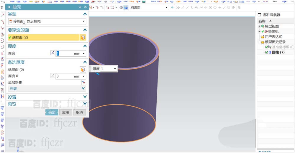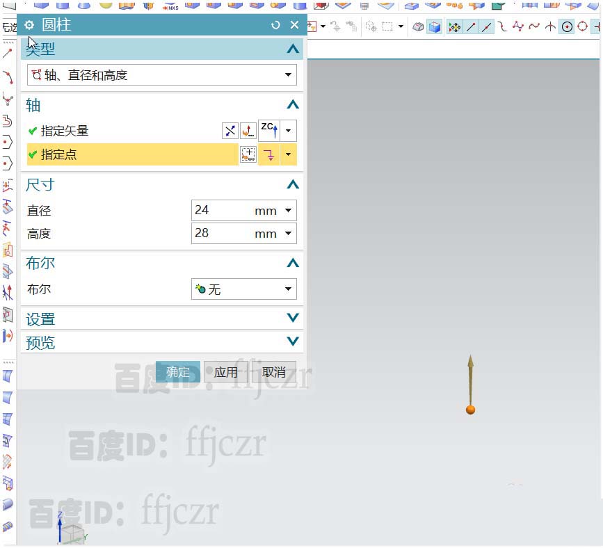 1、选用圆柱命令,创建一个圆柱直径为24,高度为28;定点在坐标原点上。对得到的圆柱进行厚度为1的抽壳。得到模型的管道主体。