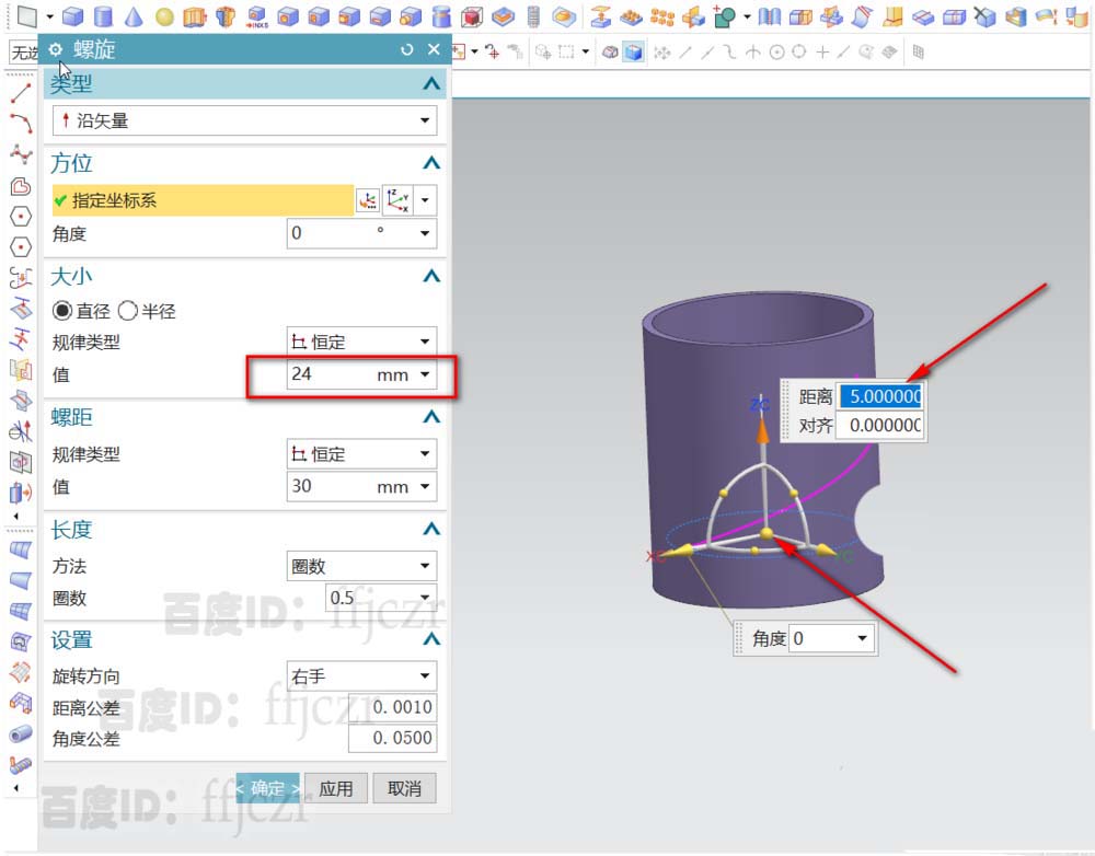 2、选用螺旋曲线命令,起点为Z正向5,直径为24;螺距为30,圈数为0.5;得到曲面的引导螺旋线。