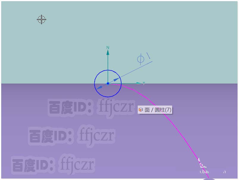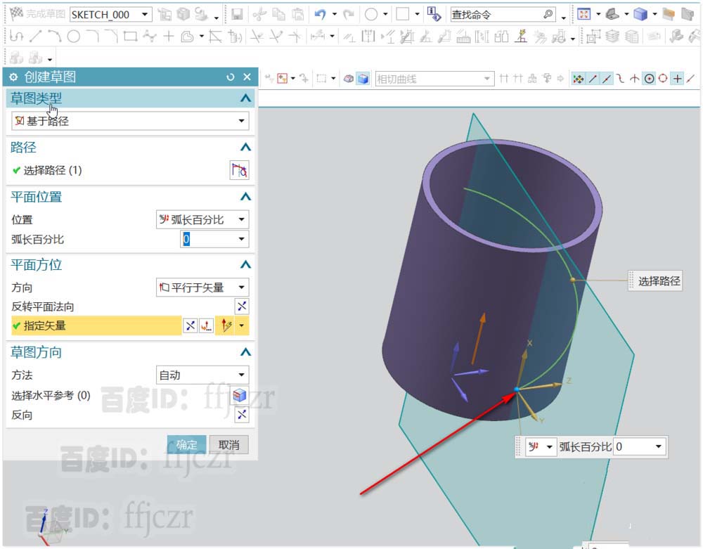 3、选择基于路径创建草图,草绘平面在路径的弧长百分之0上,方向平行于Z;在草图的坐标原点中绘出一个直径为1的圆形,此为沿路径扫掠的截面线。