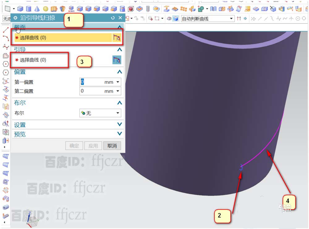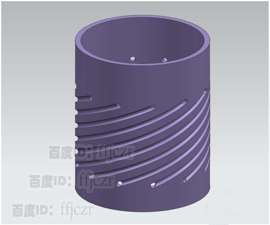 4、选用沿引导线扫掠命令,截面线为上步绘制的圆,路径为第2步绘得的螺旋线。选用布尔求差命令,得到曲面上的凹槽效果。