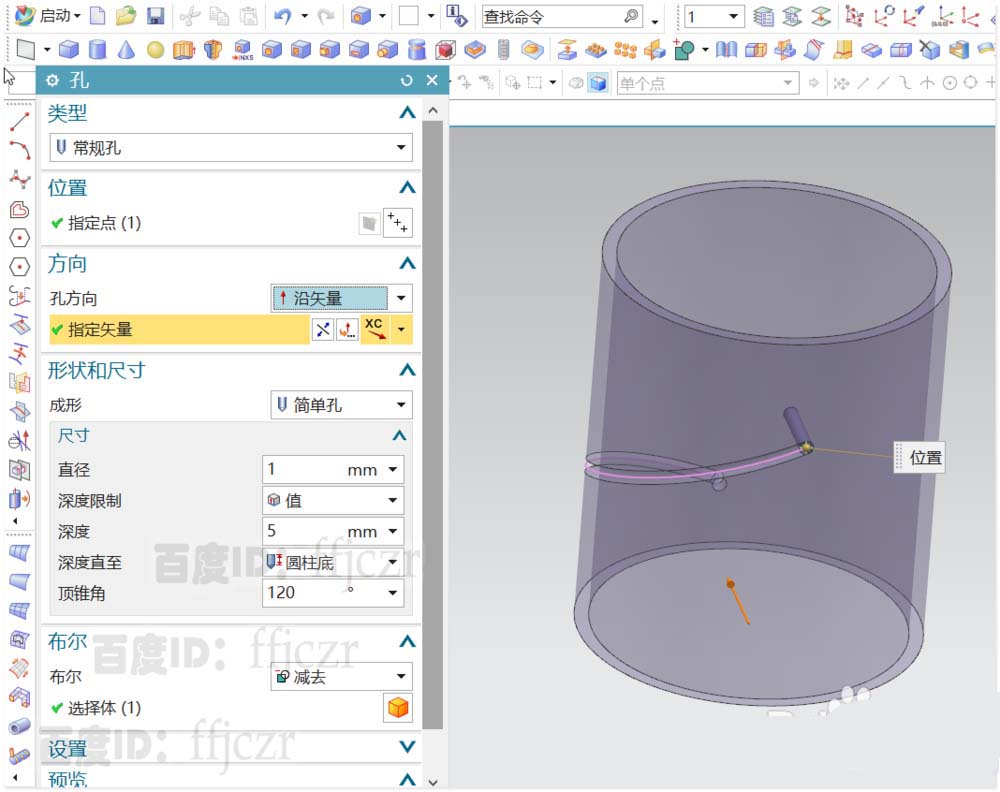 5、选用开孔命令,定点为螺旋线的两个端点,分别进长开直径为1的孔。得到一条完整的凹槽。
