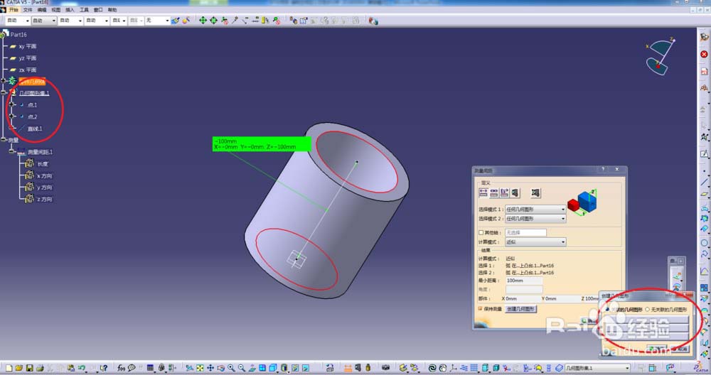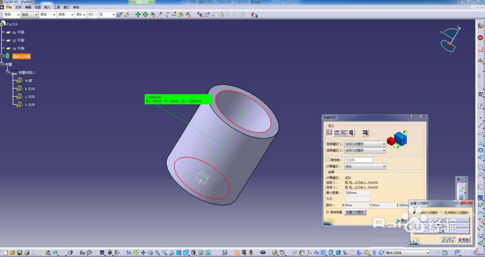 3、选择模式“任何几何图形”,分别选取圆柱底部圆心和顶部圆心进行测量;