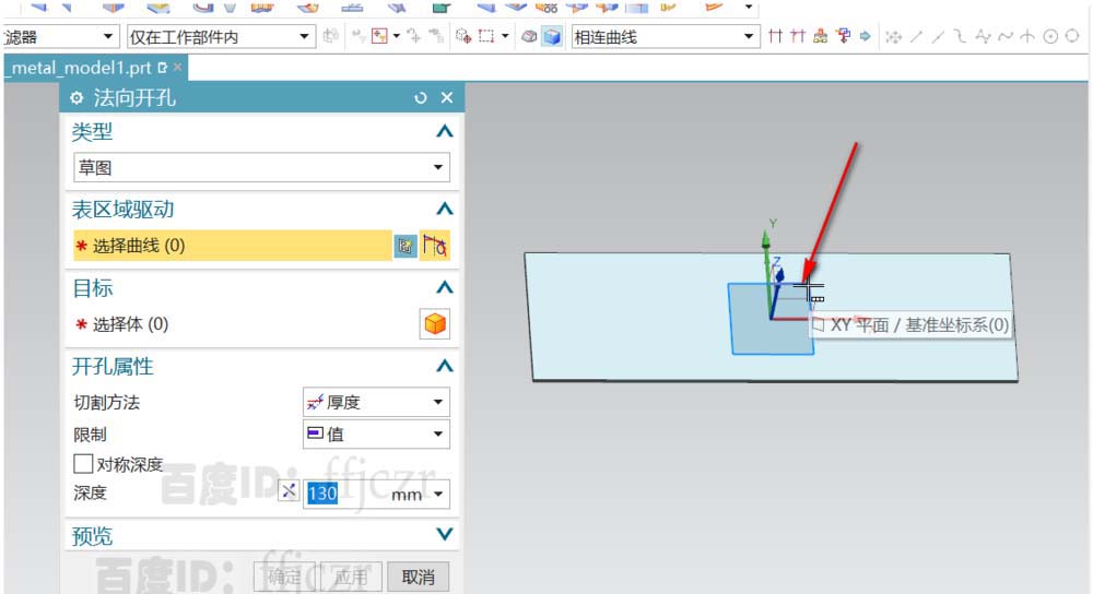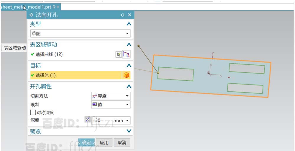 3、回到法向开孔命令对话框,如果发现所绘的截面没有产生作用,选择反方向即可。