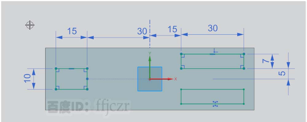 2、选用法向开孔,在突出块上进入草绘模式,绘制开孔的截面线。总共需要绘制三个矩形,其中15*10的矩形在X轴负方向上,其中心点在X轴上,该矩形距离Y轴30.另外二个矩形规格相同(30*7),只要绘出一个另一个通过镜像曲线可得到。其矩形的长为30宽为7,其中一个处在第一象限上,距离X轴15,距离Y轴5.