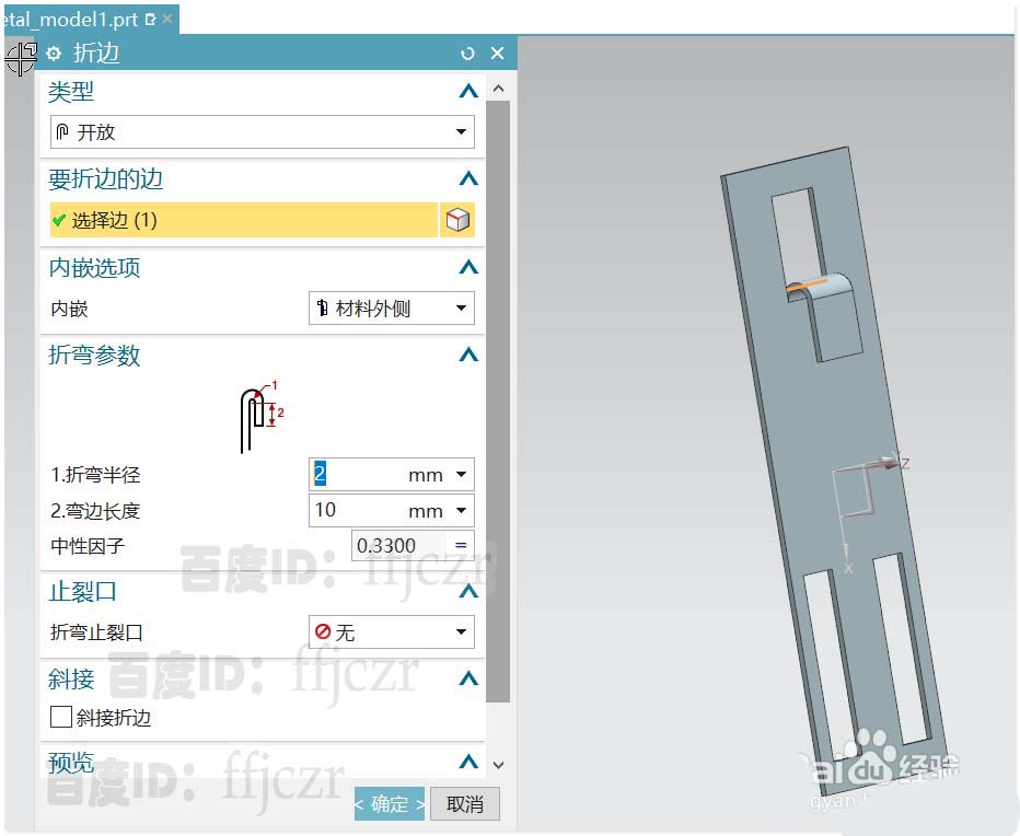 4、选用折边弯边命令,选择15*10矩形中下方的短边作为要折边的边;折弯半径为2,折弯长度为10;这样就可得到挂钩中的第一个挂钩了。