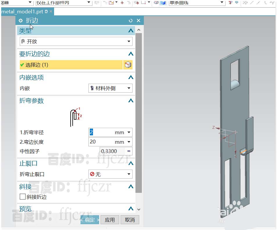 5、选用折边弯边命令,选择30*7矩形中好方的短边作为要折边的边;折弯半径为2,折弯长度为20;另一个挂钩也是同样操作。即可得到另外的一组挂钩。挂钩的创建就完成了。