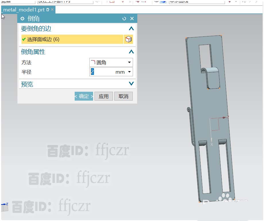 6、细节的添加。再次选用折边弯边命令,对挂钩方向向上的一组挂钩进行闭环折弯。折弯半径为0.3弯边长度为1;选用倒圆角命令,对整个模型的边角进行倒半径为2的圆角。模型创建完成。