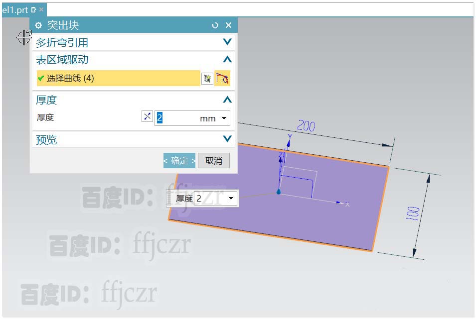 1、选用突出块,在草图中绘一个中心与世界坐标原点重合的矩形,其长为200宽为100.突出块的厚度为2.