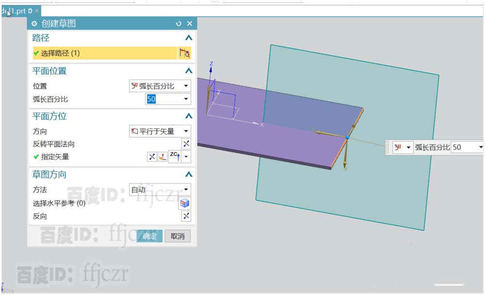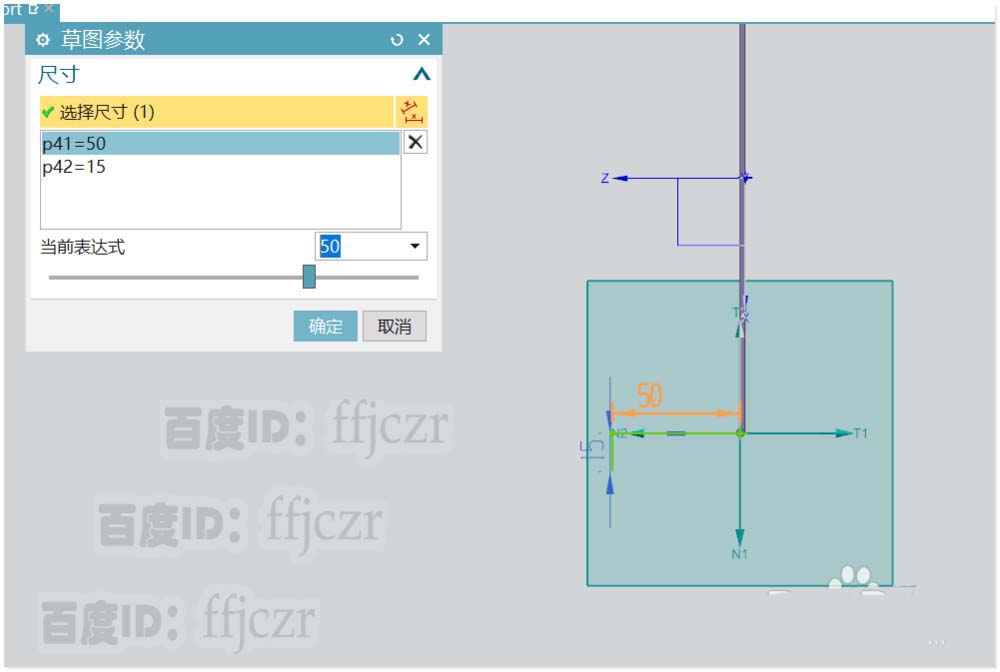2、选用轮廓弯边命令,任选突出块上表面的的一条边作为草绘截面线的平面位置;平面平行于Z轴,在草图中从新的坐标原点绘出二段直线,二段线的长分别为:50、15;具体参数如图所示。