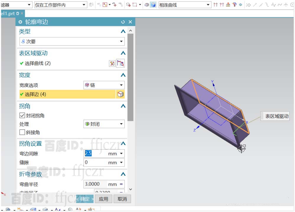 3、回到轮廓弯边对话框,宽度选项改为链,选择突出块上表面的最大轮廓线。即可得到轮廓弯边效果。
