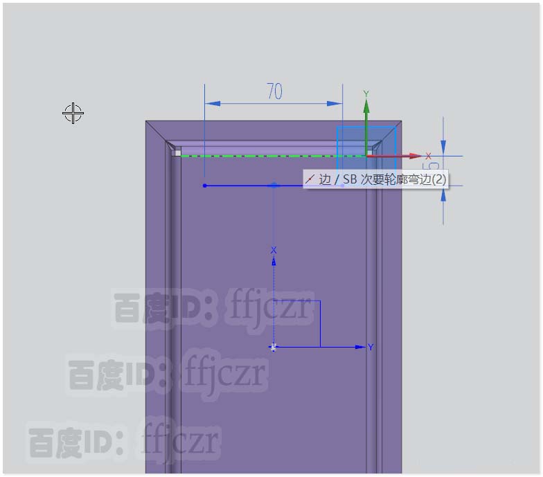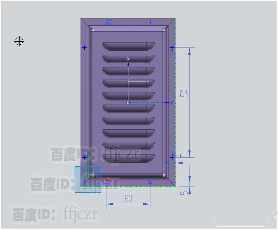 4、选用百叶窗命令,以突出块的端面为草图平面;在草图中绘一与X轴平行的直线,其长为70,距离X轴为15,直线两端点对称于Y轴。