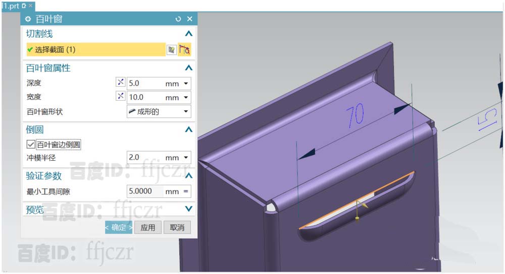 5、回到百叶窗对话框,百叶窗的深度为5,宽度为10,形状为成形的,百叶窗边倒圆半径为2.确定后得到一个百叶窗。