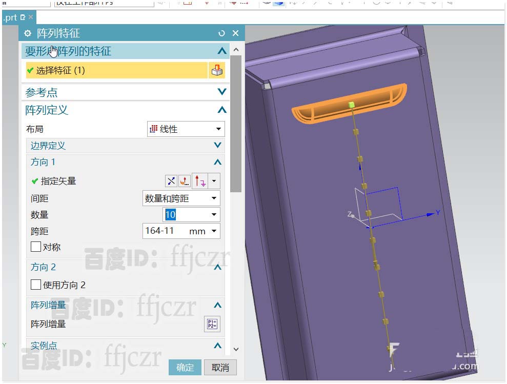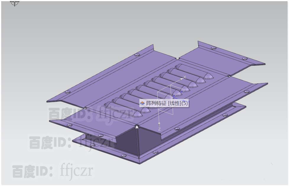 6、选用阵列特征命令,布局为线性,数量为10,跨距为153;得到整个百叶窗特征。