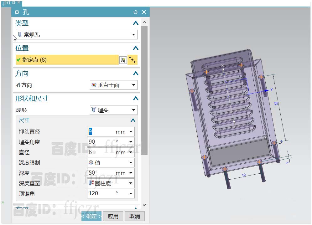 7、选用开孔命令,在折弯处进行开孔。开孔的定位如图年所示,孔为埋头孔,埋头直径为8,通孔直径为6.