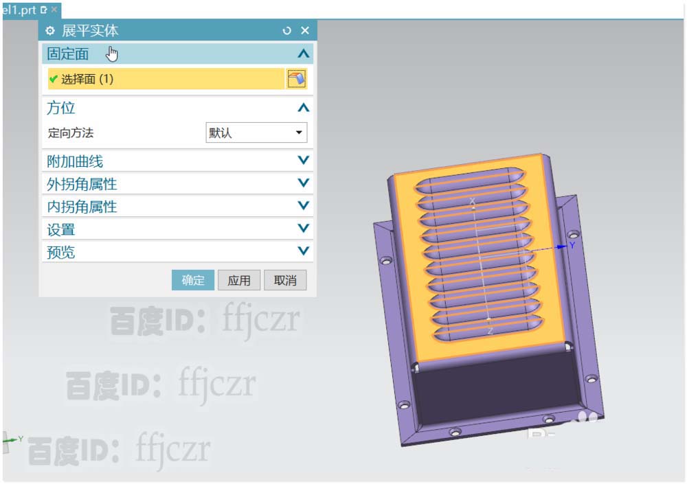 8、折弯成模型的钣金件如何展开,在模型区中可以用来观察呢?选用展平实体命令,选择突出块端面为固定面。直接点确定即可得到展开的钣金块。将展开的钣金移到其它层中,这样通过层管理就可以轻松查看二者之间的模型了。