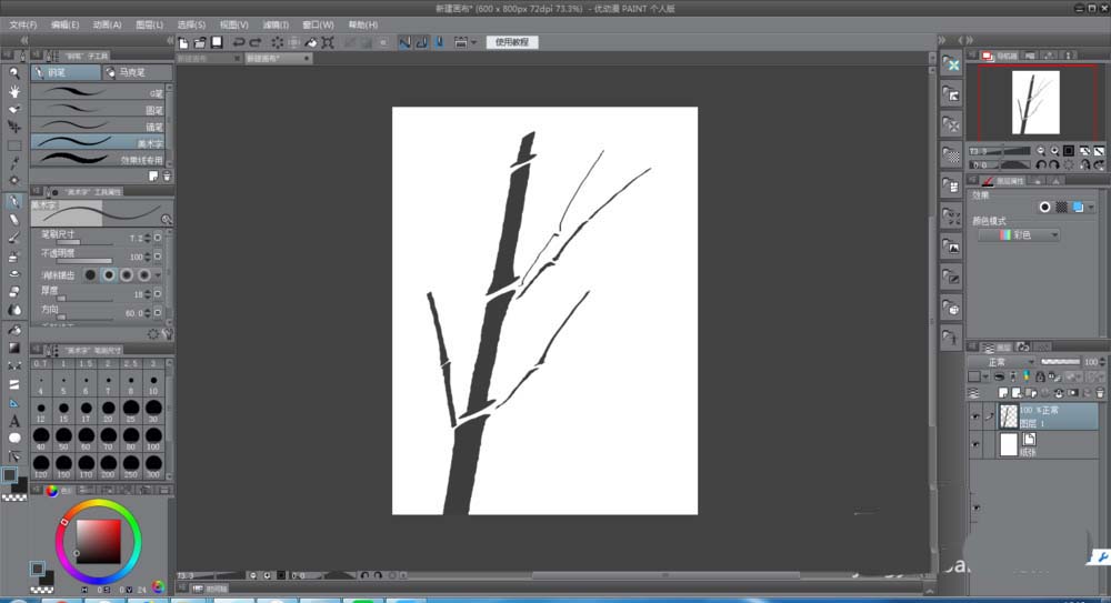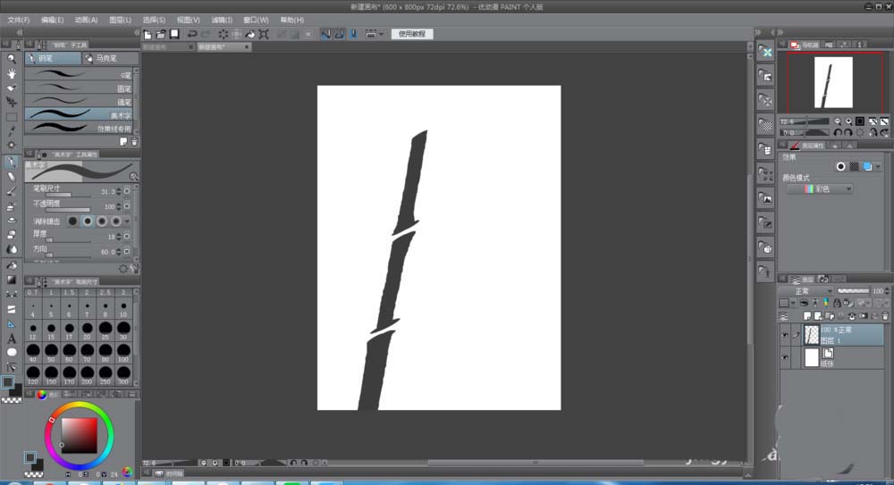 1、首先,打开优动漫PAINT软件,在新建的画布中,选择钢笔工具中的“美术字”笔刷,调整笔刷尺寸并选择一个80%左右的灰,绘制出竹子的主干部分。