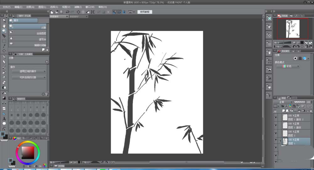 3、现在更换笔刷喽,同样选择钢笔工具中的“效果线专用”笔刷,添叶子,叶子的画法可以参考一些水墨画教学,画竹叶多用“人”字和“重人”组叶的形式较适合,自己试一试吧。