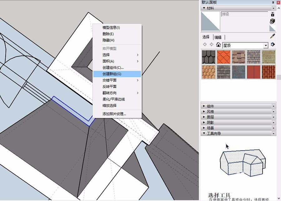 7、在模型中,对墙体、保温层等进行分别编组,即可很好的进行后期修改操作,完成墙体和保温后,我们就可以对模型进行外饰面的处理。