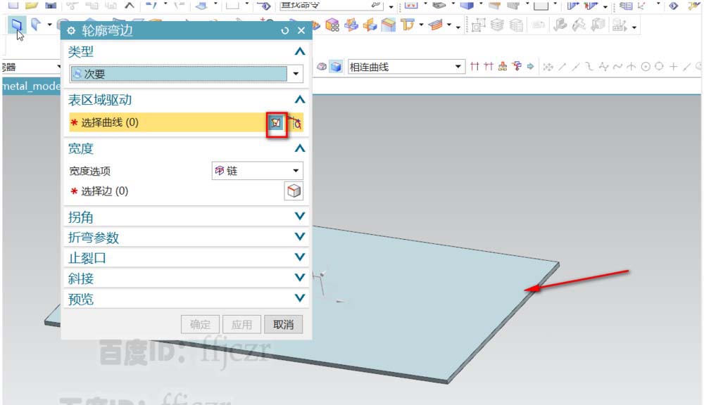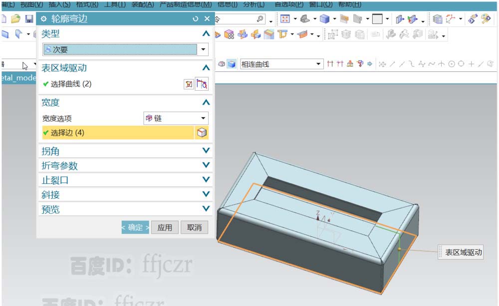 4、回到轮廓弯边对话框,其中的宽度选项修改为链,选择模式为相连曲线;用鼠标选择突出块上表面的轮廓边。软件根据上步绘的轮廓截面线自动生成折弯面。