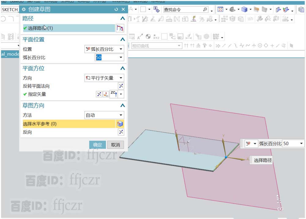 2、选用轮廓弯边,选绘制截面,在弹出的对话框中随意选用突出块上表面的一条边作为路径,弧长50%,使设定的坐标与世界坐标轴平行,这里与Z轴平行。