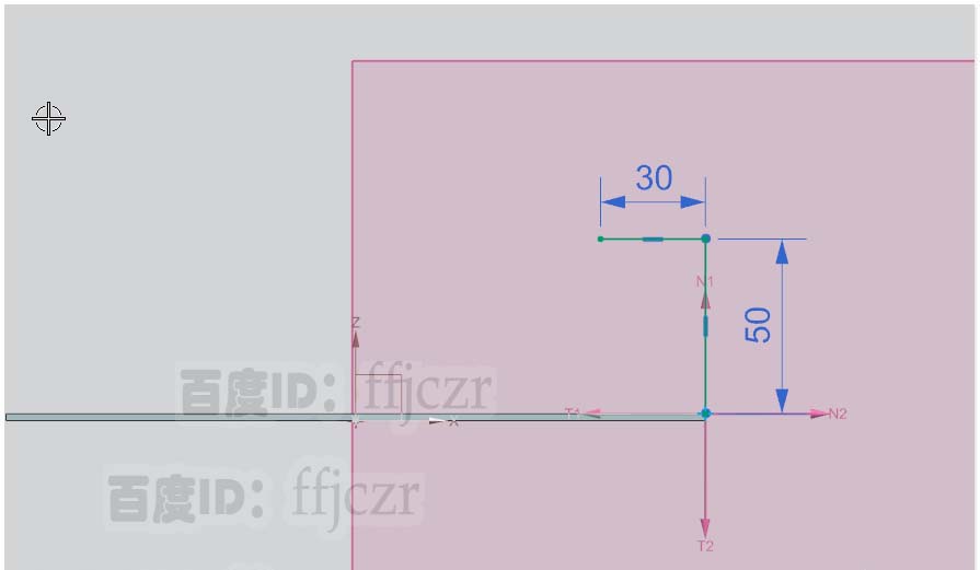 3、在草图中,以新的坐标原点为参考,绘出二段相连的直线(数据如图所示),这便是轮廓弯边的截面线。