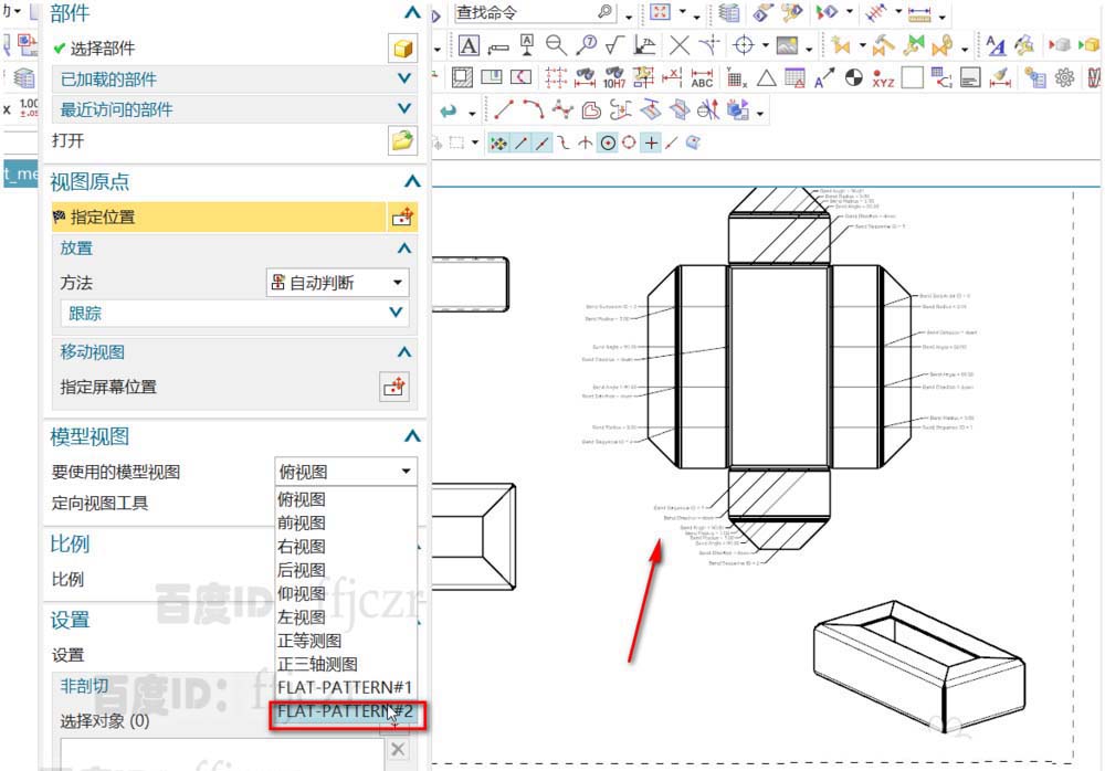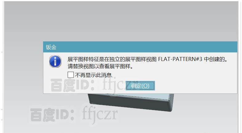 5、激活展平图样,选择模型的底面为向上面;直接确定,得到展平图样的视图。
