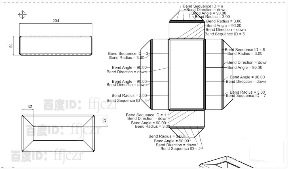 6、工程图模式中,导入俯视图和前视图后,导入展开图,模型十分简单,但其展开图却是十分重要,可以很好的指导样品的生产制作。