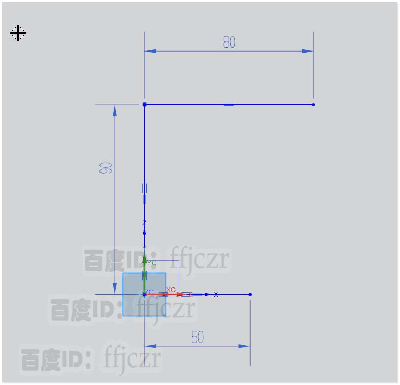1、选用轮廓弯边命令,创建一个折弯件。XZ面为轮廓弯边的截面草绘图,用轮廓曲线绘出折弯件的截面线。在X轴上绘一条长50的直线,线在X轴上其左端点与坐标原点重合;从原点绘一条在Y轴上的直线,长90,从该直线的另一端点处绘一水平线,长为80,并与上一直线垂直;截面线绘制完成。