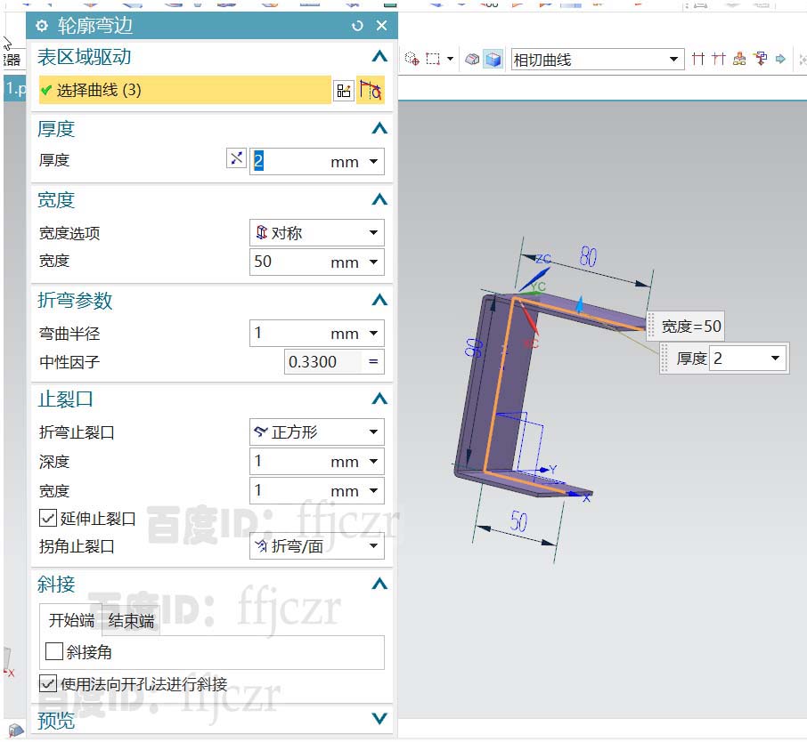 成草绘后,在轮廓弯边对话框中设置折件的厚度为2,宽度选项为对称,宽度为50;确定后得到一个折弯件。